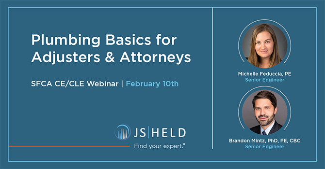 Two of J.S. Held’s top forensic engineers, Michelle Feduccia, PE, and Brandon Mintz, PhD, PE, will present a one-hour* CE/CLE course on plumbing basics for adjusters and attorneys.